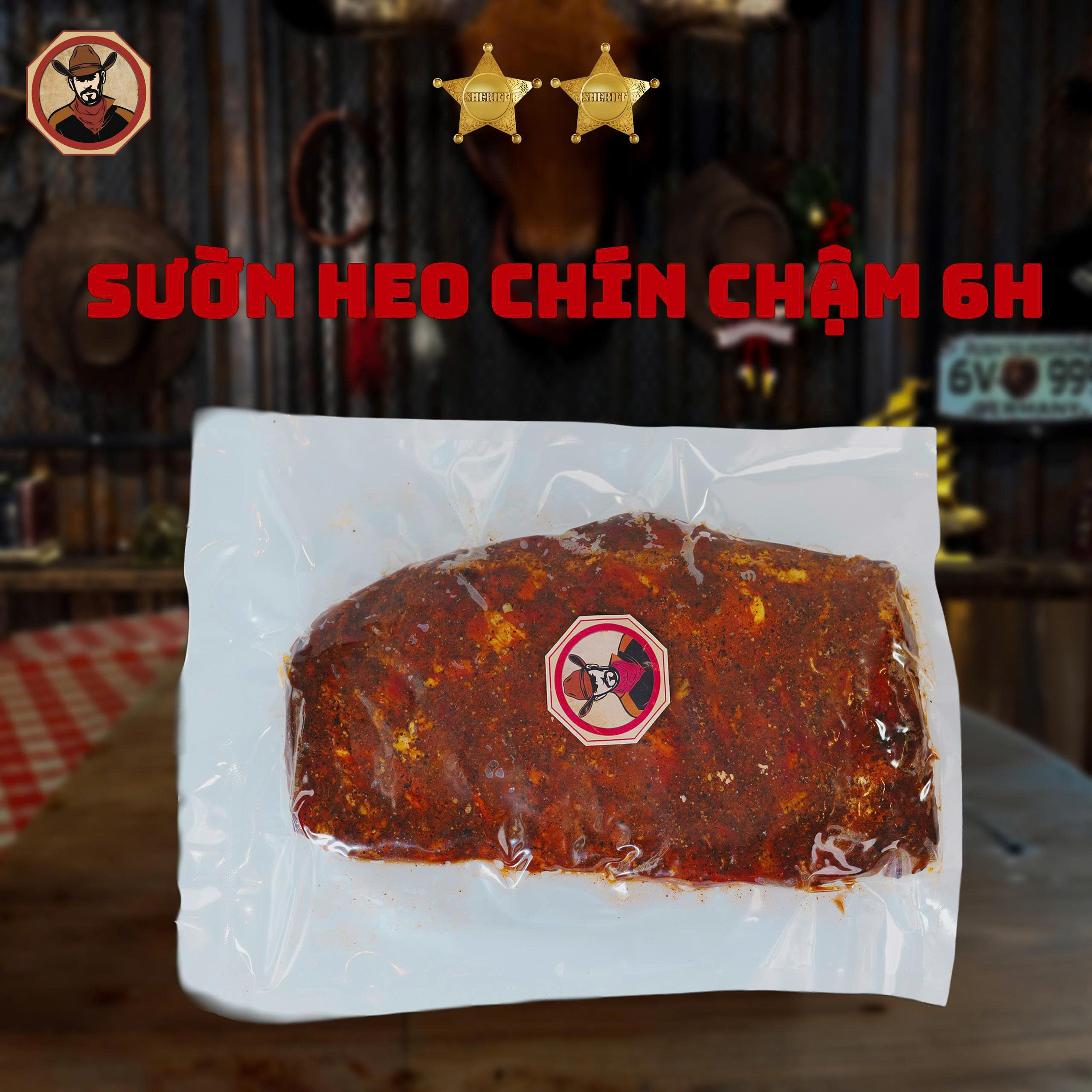 Nguyên liệu: Sườn heo nhập khẩu được tẩm ướp bằng hỗn hợp gia vị khô đặc trưng từ các loại thảo mộc kiểu Texas, sau đó nướng chậm trong 6giờ bằng gỗ sồi trắng để giữ trọn vị ngọt tự nhiên và hương khói lan tỏa. Thịt sườn mềm tách xương, lớp ngoài đẹp mắt được tạo bởi lớp gia vị và khói, xen lẫn sự mềm mọng trong từng thớ thịt -đặc trưng của phong cách Texas.
