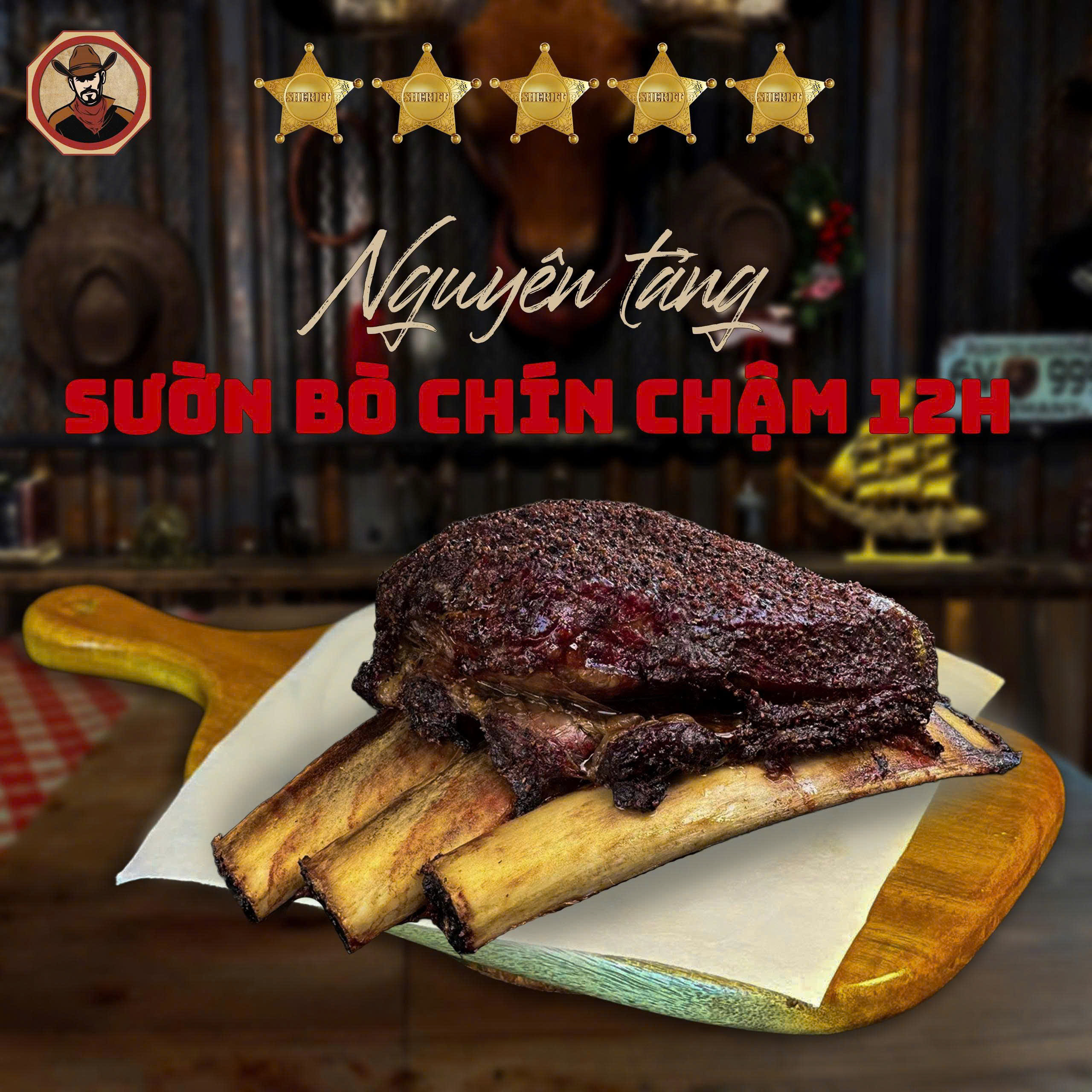 Nguyên liệu: Phần sườn bò AAA cao cấp Tiêu Chuẩn của Châu Mỹ nhập khẩu được chọn lọc từng tảng dựa theo trọng lượng và tỉ lệ mỡ nạc (marbling). Sau đó được tẩm ướp với hỗn hợp gia vị khô đậm phong cách Texas. Thịt được nướng chậm suốt 12 giờ bằng gỗ sồi trắng với nhiệt độ